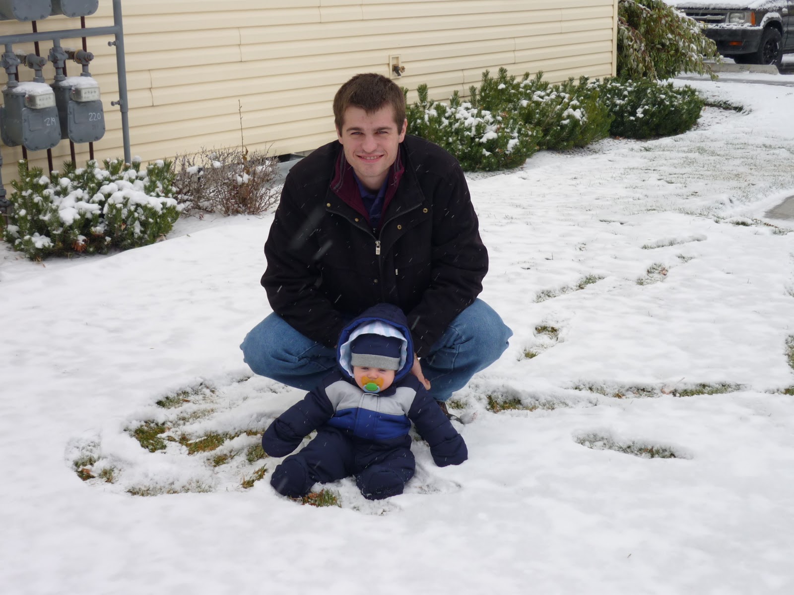 Last night it snowed and all day it has snowed so Adam and I took our little monkey, Kaleb, out in the snow for his first time ever. We only were outside for a few minutes because I don't want him out in the cold too long since he's still really little. He's not even 3 months old. We had him dressed in an over sized snow suit the Aunt Donna got him. The snow suit was huge!